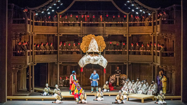투란도트 공주가 나타나 아리아 '옛날 이 궁전에서(In questa Reggia)'를 노래하며, 자신이 수수께끼를 내는 이유를 알려 줍니다